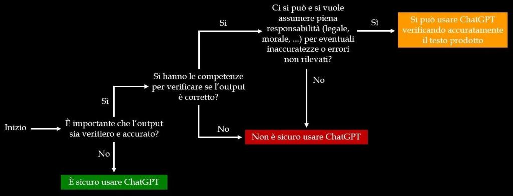 Ecco il senso del grafico: le risposte di ChatGPT possono contenere errori e informazioni false o non accurate. Se questo non costituisce un problema allora è senz’altro sicuro usare il modello, in caso contrario occorre chiedersi se si hanno le competenze necessarie per verificare se l’output di ChatGPT sia corretto e accurato oppure no. Se non si possiedono queste competenze allora non è sicuro usare ChatGPT, altrimenti, come ultimo passo, è necessario domandarsi se ci si può – e si vuole – assumere la piena responsabilità, sotto ogni punto di vista, per eventuali errori o inaccuratezze non rilevate. Se la risposta è no allora, di nuovo, non è sicuro utilizzare ChatGPT, e se invece è sì l’output del modello si può utilizzare dopo averlo attentamente verificato. Le stesse indicazioni valgono per altri sistemi, come ad esempio Bard di Google, ma anche più in generale. Nel suo corso Thrustworthy Generative AI il prof. Jules White (Vanderbilt University) invita a pensare a questo problema in termini di rischio: usare i risultati prodotti da una IA quali conseguenze potrebbe avere? Ci potrebbero essere serie ripercussioni sulle persone? Danni economici o alla propria reputazione? Altri importanti effetti negativi? E ancora: verificare le risposte ottenute è facile o difficile? Se utilizzare l’output di una IA può avere conseguenze importanti, verificare le risposte ottenute è difficile e non si hanno le competenze per farlo allora è senz’altro raccomandabile non usare l’IA oppure utilizzarla in modo tale da ridurre i rischi. Come? White fa questi esempi: non va chiesto a ChatGPT se sia sicuro assumere il farmaco X (rischio elevato), ma eventualmente quali domande sia opportuno fare a un medico, cioè a un esperto, per valutare se sia sicuro assumere X date le proprie condizioni di salute (rischio minore, al più alla propria reputazione). E ancora: anziché chiedere a ChatGPT di estrarre/riassumere informazioni critiche da un certo documento (rischio alto) si può chiedergli di individuare dove, in quel documento, si trovino quelle informazioni (rischio più basso). Usare correttamente l’IA non richiede meno competenze, ma più competenze, nonostante i mille imbonitori che spacciano l’IA stessa per una specie di genio della lampada che fornisce la soluzione di questo o quel problema senza che si debba fare nulla. Una storia già sentita un milione di volte, e altrettante volte rivelatasi falsa, se non pericolosa.